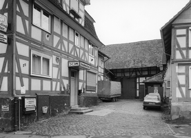 Hart an die Straße grenzt das Wohnhaus einer Hofanlage mit abschließendem Mansarddach und einer Fachwerkkonfiguration aus dem Ende des 18. Jhs., bestehend aus Mannfiguren, Hals- und Brustriegeln an den Eckständern. Die Fußstreben knicken deutlich ab. Dazwischen im Brüstungsbereich gegenläufige Fußstreben. Im Untergeschoss jüngeres Fachwerkgefüge. Auf das Wohnhaus folgen jüngere Wirtschaftsgebäude sowie eine die Parzelle abschließende Scheune aus der Bauzeit des Wohnhauses.