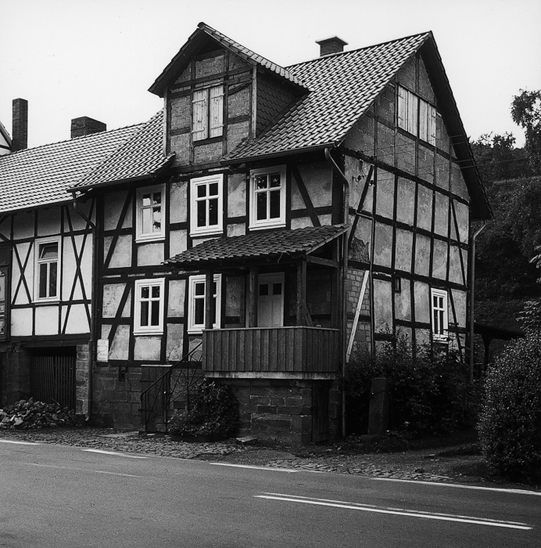 Rechter Teil einer markanten Gebäudegruppe gegenüber der Einmündung der Straße von Weißenbach. Zweigeschossiges Fachwerkwohnhaus über hohem Sockel in einer Fachwerkkonstruktion aus der Mitte des 19. Jhs. mit einfach verriegelten Stockwerkstreben in den Eckgefachen. In das abschließende Satteldach ist ein schmuckloses Zwerchhaus eingestellt. Auf Grund seiner Lage ist das Haus Kulturdenkmal aus städtebaulichen Erwägungen.