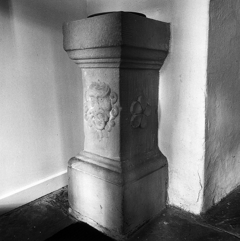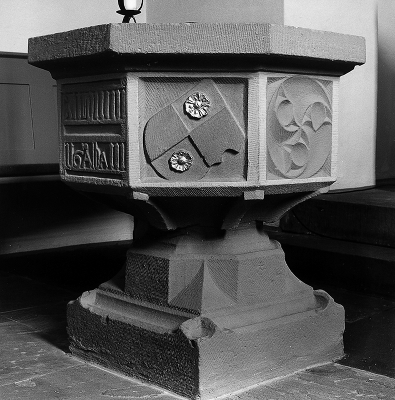 - Der Taufstein erhebt sich über einem qualitätvoll durchgebildeten Sockel zu einem oktogonalen Becken, dessen Seiten von Inschriften, Wappen und Ornamenten besetzt werden. Eine Datierung um 1500 scheint möglich.