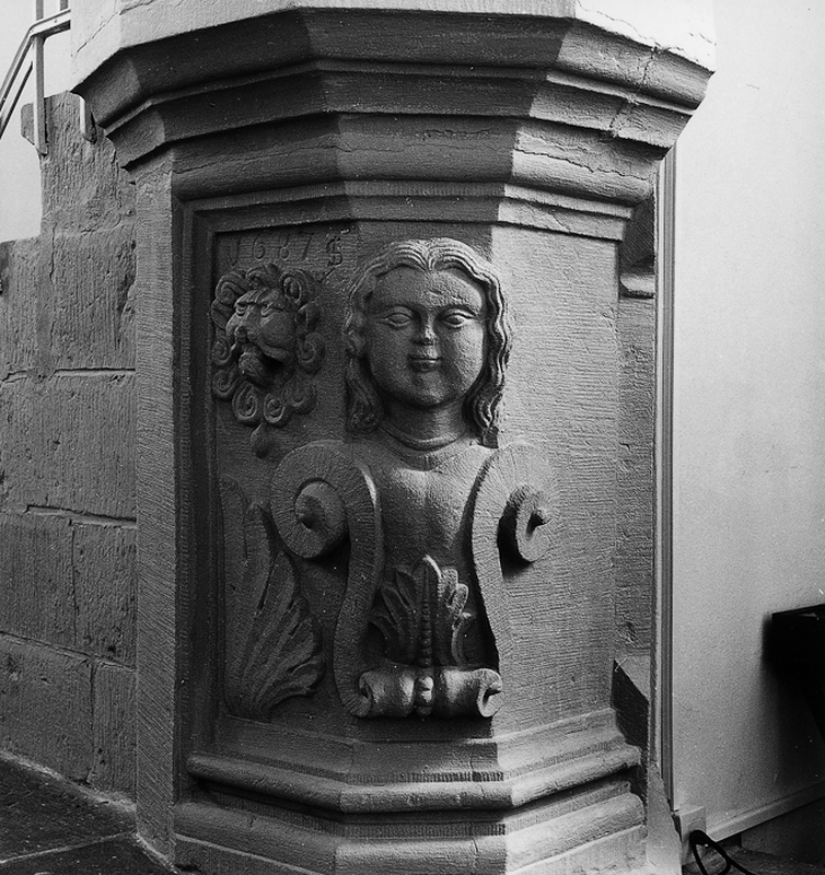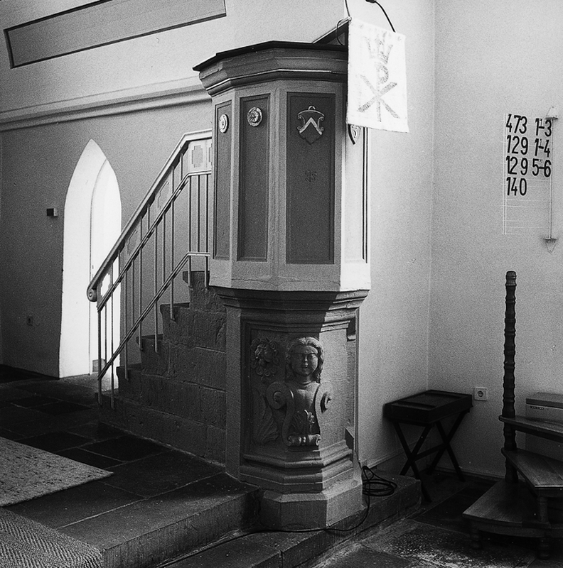 - Die Kanzel aus Sandstein mit dem 1605 datierten reich geschmückten Kanzelkorb, der über einem Sockel aus dem Jahr 1687 aufsitzt.