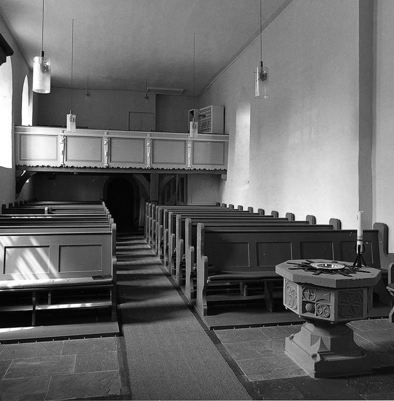 Der Innenraum verdeutlicht die drei am Außenbau ablesbaren Bauphasen. An das gewölbte Turmuntergeschoss folgt das flach gedeckte Schiff mit einseitiger Empore sowie der von einer Spitztonne geschlossene Chor, der durch einen Triumphbogen deutlich vom Schiff abgesetzt wird.