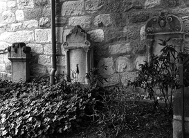 - An der Nordseite der Kirche befinden sich drei Grabsteine aus dem 18. Jh.