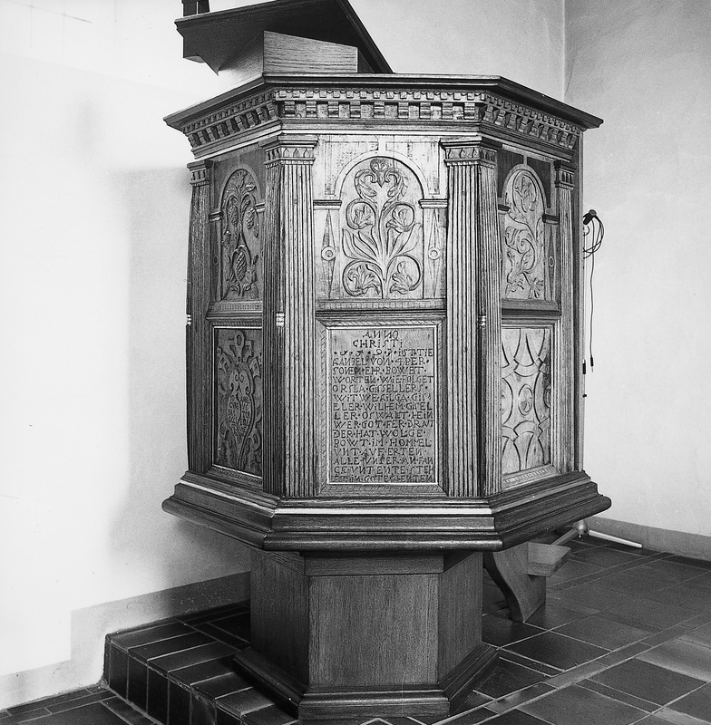 Die Kanzel der Kirche wurde 1593 gestiftet. Der der Gemeinde zugewandte Corpus wird von Doppelpilastern in vier hochrechteckige Parzellen gegliedert, die wiederum ein schmaler Mittelsteg teilt. Eines der Felder trägt die Stiftungsinschrift, die anderen sind mit Intarsien versehen, die in eine Rundbogenblende eingebettet sind.