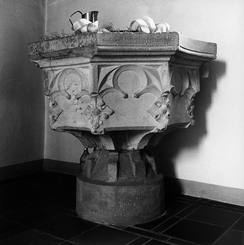 Erhalten hat sich ein oktogonales Taufbecken aus dem 15 Jh., dessen : von Maßwerkblenden belegt werden. Die Ecken werden von stilisiertem Blattwerk besetzt (siehe Seite 52).