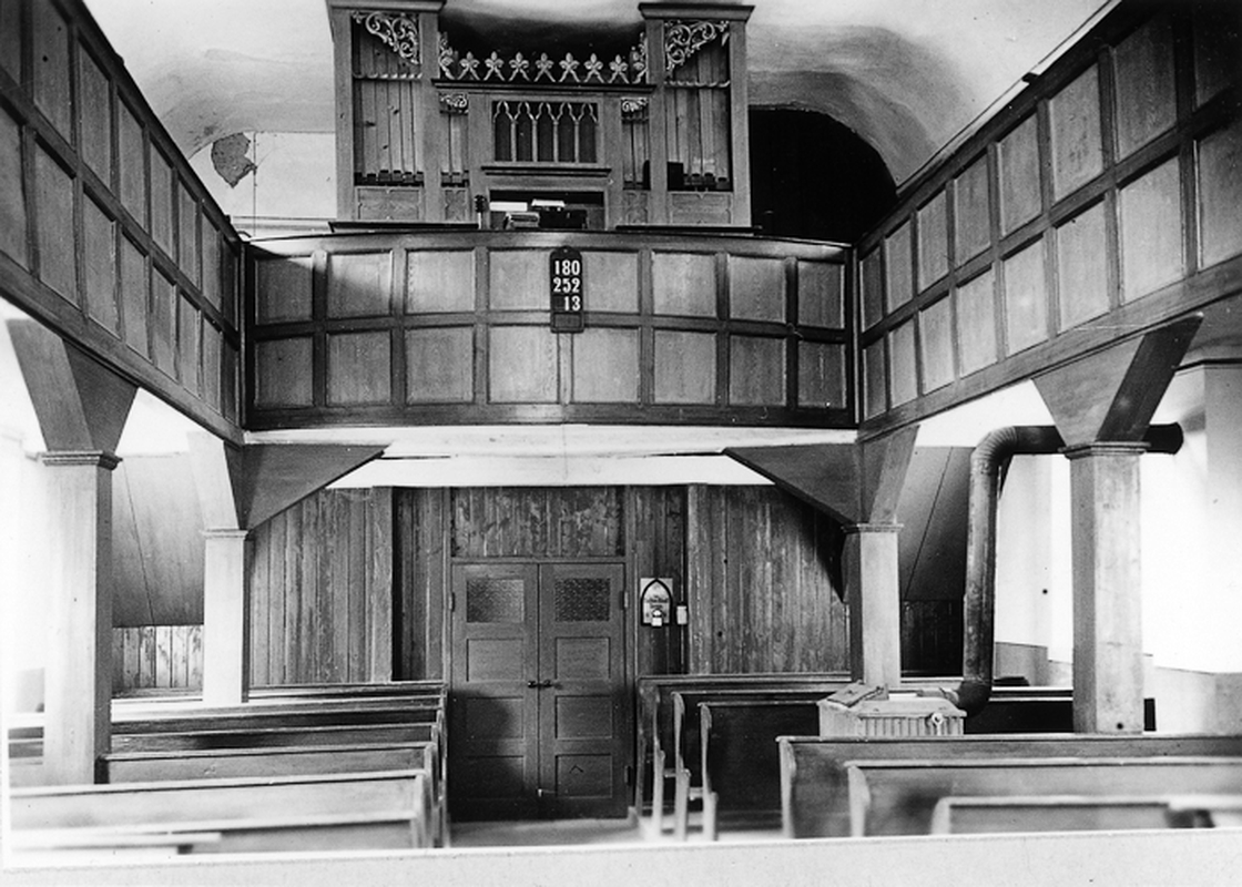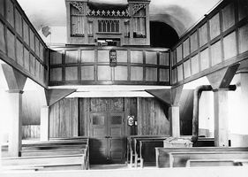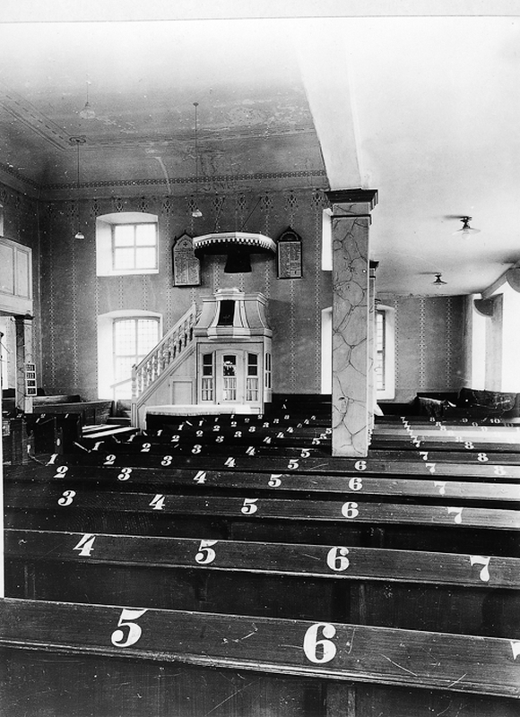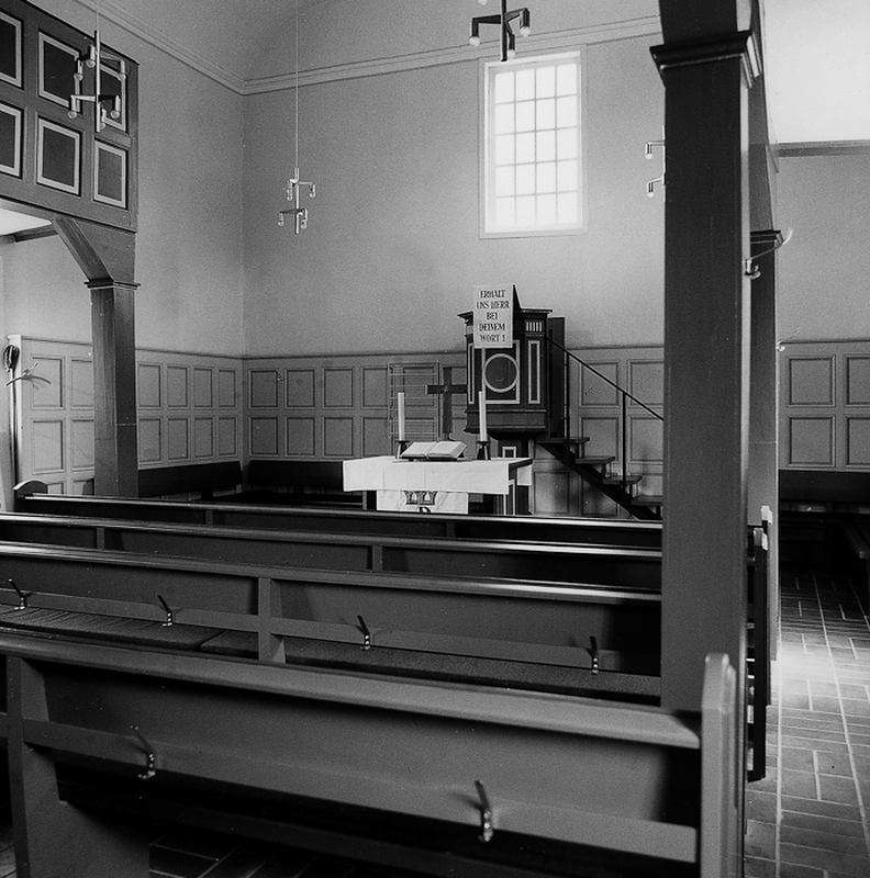 Der Innenraum ist schmucklos mit einer dreiseitig umlaufenden Empore ausgestattet und wird von einer Muldendecke geschlossen. Kanzel, Altar und der vergitterte Pfarrstand stammen aus der Bauzeit. Schützenswert ist die Ummauerung der Kirche.