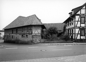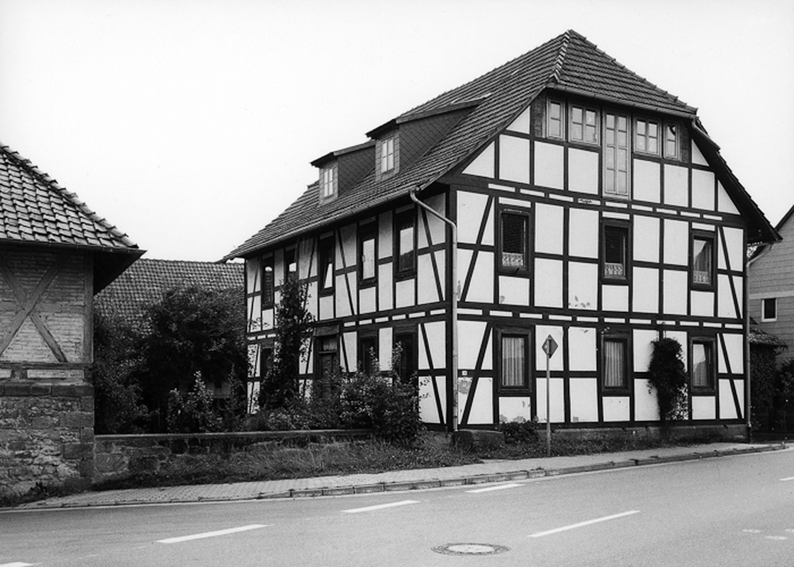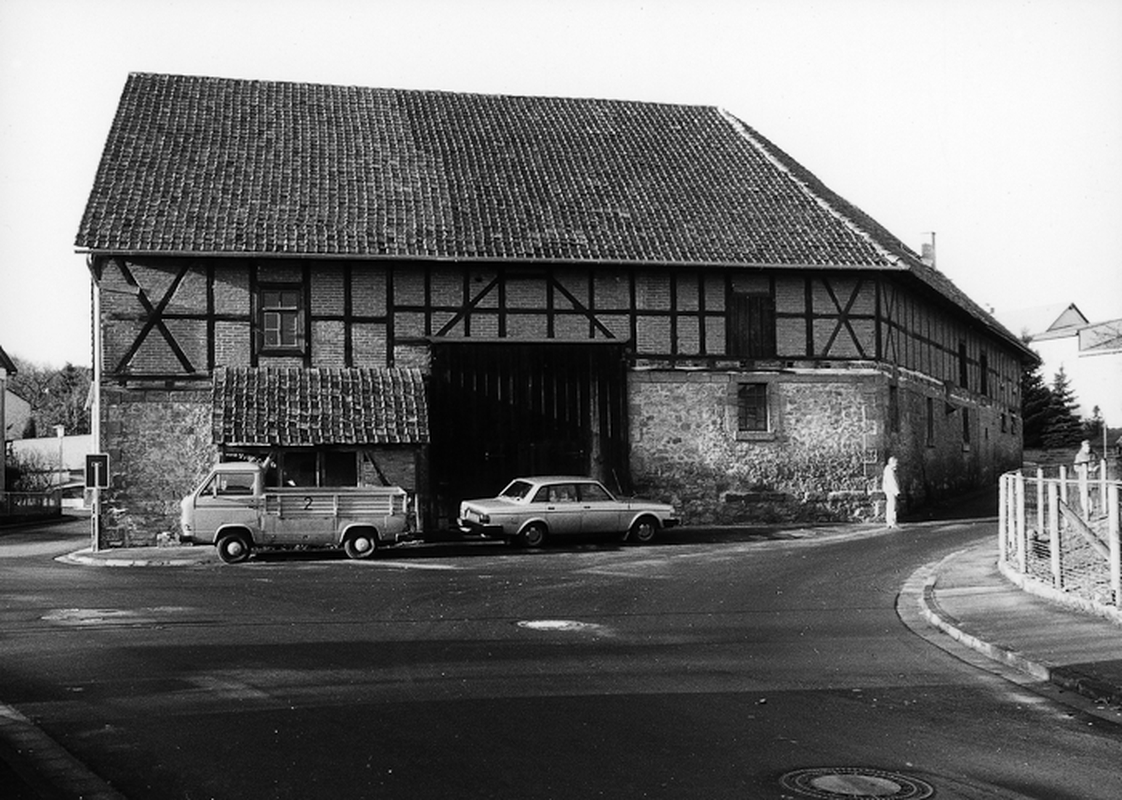 Markante Hofanlage über spitzwinklig angeordnetem Eckgrundstück mit giebelständigem Wohnhaus in einfacher Fachwerkkonfiguration aus der Mitte des 19. Jhs., bestehend aus Stockwerkstreben mit einfacher Verriegelung. Abgeschlossen wird das Haus von einem Krüppelwalmdach. Gegenüber dem Wohnhaus befindet sich ein Stallgebäude mit Quadermauerwerk im Untergeschoss, darüber sitzt ein Futterboden in konstruktivem Fachwerk auf. Den hinteren Bereich der Parzelle besetzt eine große Scheune in einfacher Fachwerkkonstruktion mit aufgesetztem Kniestock. Als einer der größten historischen Höfe des Ortes ist die Anlage aus ortsgeschichtlichen und städtebaulichen Gründen schützenswert.