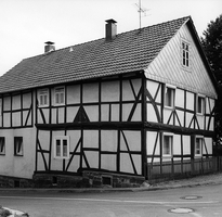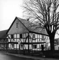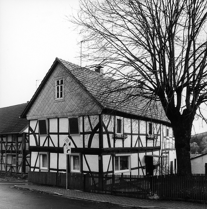 In einer Kurve gelegenes Fachwerkwohnhaus mit einem baulichen Kern aus der Mitte des 16. Jhs. Die charakteristische Fachwerkkonfiguration besticht durch die stark gebogenen 3/4-Streben an den Eckständern, die durch ein Kopfband zusätzlich arretiert werden. Der Geschossüberstand ist kräftig ausgebildet, die traufseitige Schwelle ist dreifach getreppt, um das abfallende Terrain auszugleichen.