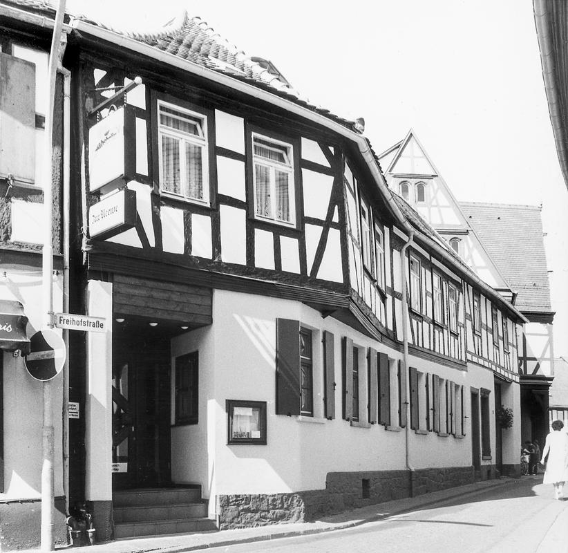 Langgestreckter Traufenbau mit überbautem Hoftor, im Grundriss dem leichten Knick am Übergang von der Freihofstraße zum Freihofplatz folgend. An dieser Stelle kragt das Obergeschoss schräg vor. Das barocke Fachwerk der straßenbildbestimmenden Fassade um 1800 durch Fenstereinbauten verändert. Kulturdenkmal aus städtebaulichen Gründen.