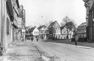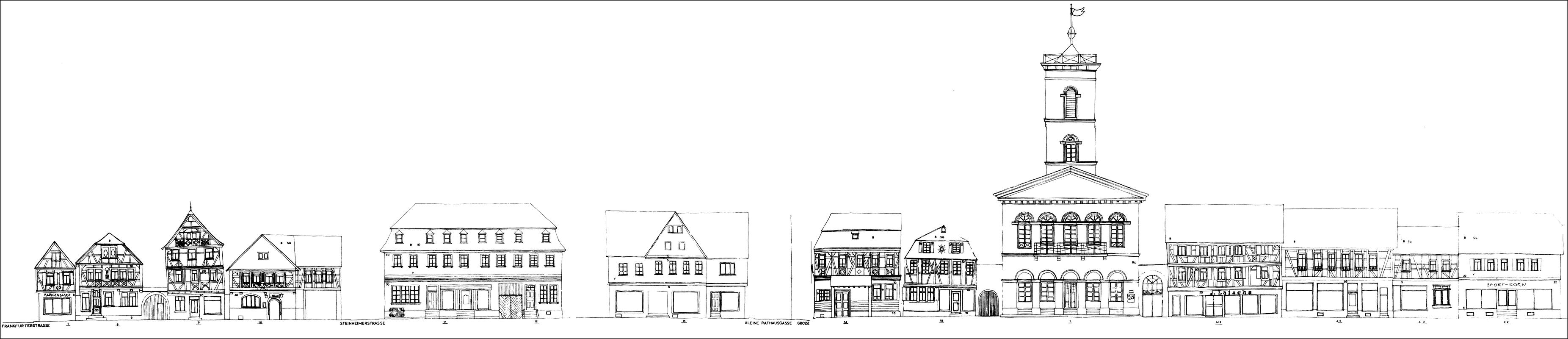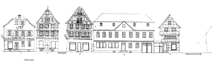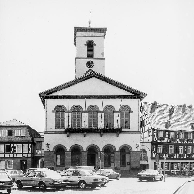 Der klassizistische Neubau in Nachfolge der Moller-Tradition wurde 1823 anstelle eines Fachwerk-Rathauses von 1539 - der Gründungsstein ist in der Außenwand eingelassen - nach Entwurf von G. Lerch errichtet; ähnlich sein Rathaus in Langen 1826-27. Der kubische, in der äußeren Gliederung zweigeschossige Bau auf nahezu quadratischem Grundriss mit flachem Satteldach und hohem Glockenturm schiebt sich aus der Flucht des südöstlichen Marktplatzrandes vor und dominiert durch Maßstab und Dimension inmitten der eher kleinteiligen Fachwerkbebauung. Die Hauptfassade fünfachsig mit offener Arkadenhalle, darüber hohe Rundbogenfenster mit verbindendem Kämpfergesims und vorgelagertem Balkon. Das Konsolgesims des flachen Dreiecksgiebels, Gurtgesimse, Gewände und Pfeiler heben sich in Sandstein von der hellen Putzfassade ab. Rückwärtig neue Erweiterung. Der zweigeschossige Mittelturm überragt weit sichtbar die Stadtsilhouette. Kulturdenkmal aus geschichtlichen, künstlerischen und städtebaulichen Gründen.