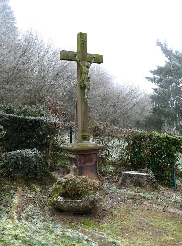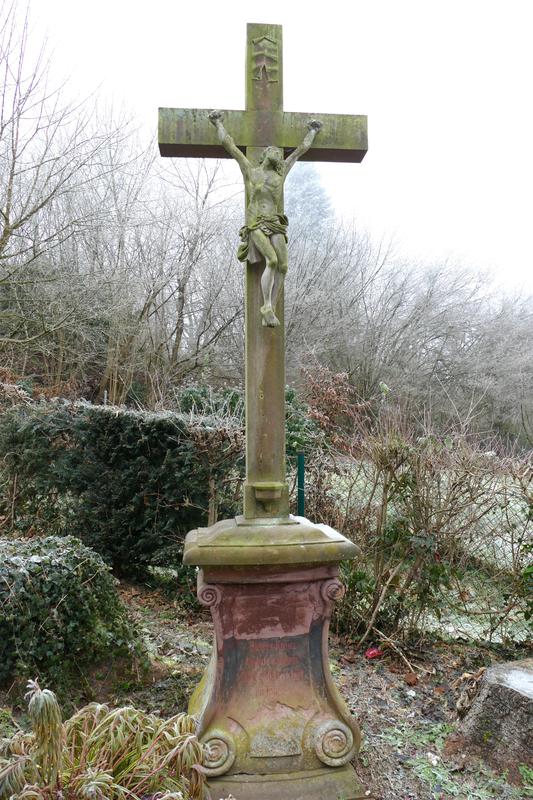 Friedhofskreuz von 1858 aus Sandstein, die Datierung mit Inschrift am barockisierenden Volutensockel. In diesem Jahr wurde der Friedhof, der zu Beginn des 19. Jahrhunderts angelegt wurde, erweitert.