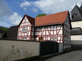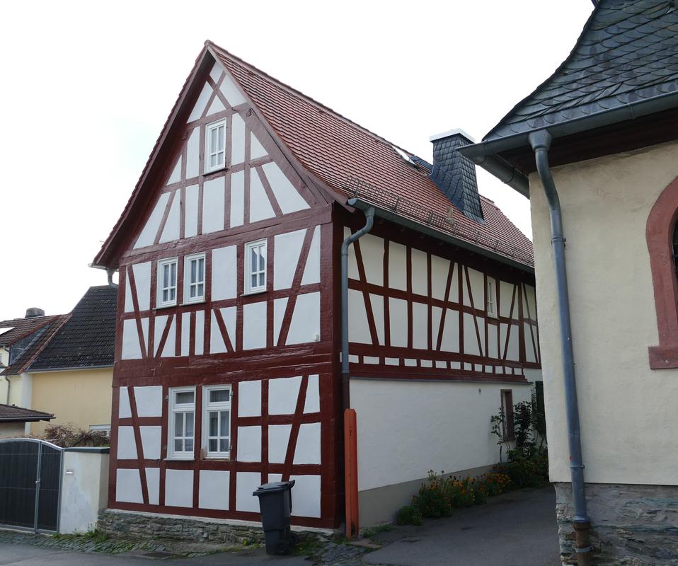Giebelständiges Fachwerkwohnhaus einer Hofreite mit rückwärtig angebauter Scheune des 18./19. Jahrhunderts. Das zweigeschossige Wohnhaus auf verputztem Sockel und mit massiver Westwand im Erdgeschoss besitzt Geschossteilung durch Holzgesimse und originale Fensterverteilung. Die Rähmkonstruktion, im Erdgeschoss zweiriegelig, im Obergeschoss einriegelig, wurde vermutlich in der Mitte des 18. Jahrhunderts errichtet. Relativ enge Ständerstellung mit halben und ganzen Verstrebungen. Satteldach mit Aufschiebling und Biberschwanzziegeldeckung.