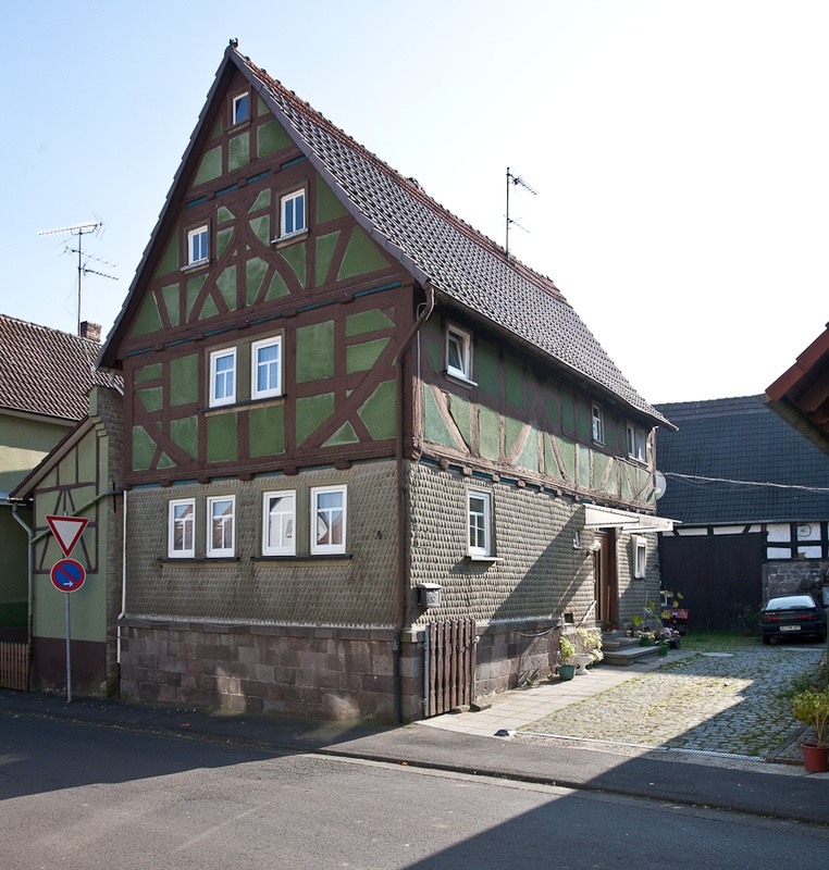 Unweit der Einmündung der Herrnstraße in die Licher Straße liegt eines der größten Fachwerkwohnhäuser Hattenrods. Es handelt sich um einen giebelständigen, dreizonigen, um 1700 errichteten Bau, der durch seinen hohen gequaderten Natursteinsockel auffällt. Über diesem Sockel, der oben mit einem Sims abschließt, erhebt sich das gänzlich verschindelte Untergeschoss, das auf der Vorderseite mit vier paarweise angeordneten Fenstern ausgestattet ist. Das darüber ansetzende symmetrisch aufgebaute Fachwerkgeschoss ist einschließlich des Giebels vollständig erhalten. Außer den profilierten Quergebälken, die im Giebelbereich durch gerundete Füllhölzer besonders plastisch erscheinen, sind es vor allem die „Mannfiguren", die das Gebäude sowohl auf der Giebel-, als auch auf der Traufseite prägen. Sie sind durchweg weit ausgreifend, haben stark geschwungene Streben und Halsriegel und sind auf der Vorderseite mit Gegenstreben versehen. Zusätzlichen Schmuck bieten die Fächerrosetten in den Kopfwinkelhölzern und vor allem das zentrale Giebelmotiv, das als „Mannfigur" mit konvex geschwungenen Streben und Gegenstreben ausgebildet ist. Einschließlich der alten Eingangstür mit Oberlicht, die separat verdacht und mit einer Außentreppe versehen ist, der rückwärtigen Scheune (Licher Str. 27) sowie der Bruchsteinmauereinfriedung ist das Gebäude aus künstlerischen und städtebaulichen Gründen Kulturdenkmal.