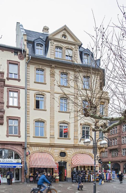 Die Kopfapotheke zählt zu den markantesten Gebäuden der Gesamtanlage Braubachstraße. Der Architekt nutzte die Ecksituation für die Ausbildung eines repräsentativen Eingangs und variierte die beiden Fassadenhälften auf unterschiedliche Weise. Ihren herrschaftlich anmutenden Charakter erhalten die beiden Fassaden durch die Anwendung von Kolossalpilastern und die jeweilige Andeutung eines Mittelrisalits.