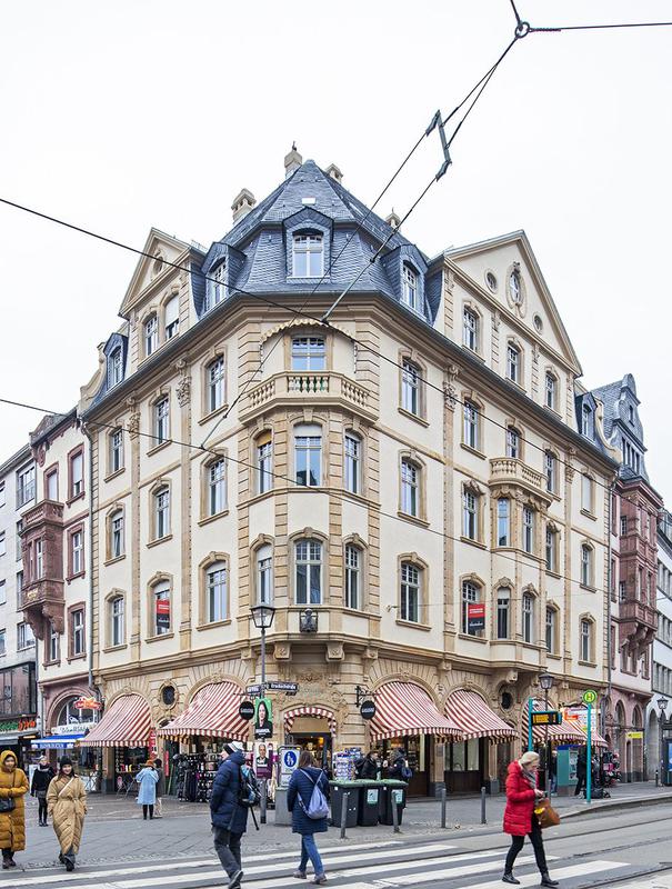 Ein mehrfach profiliertes, vorkragendes Gesims vermittelt zu den Obergeschossen, achsenweise unterbrochen von Konsolsteinen, die die aufsitzenden Kolossalpilaster und Ecklisenen tragen, deren Postamente und Basen sich um das Gesims verkröpfen. Die Pilaster umgreifen drei Geschosse und trennen die Fensterachsen voneinander. Oberhalb des Eckeingangs wurde ein dreiseitiger Erker auf kräftigen Konsolen gebaut. Die drei Seiten des Polygons sind mit rustizierten Ecklisenen besetzt. Der Erker endet im dritten Obergeschosse in einem Balkon. An der Südseite findet sich über dem Nebeneingang ebenfalls ein Erker, der mit seinen abgerundeten Ecken eine Fensterachse einnimmt. Sämtliche Fenster sind mit Ohrungen und Schlusssteinen versehen. Das dritte Obergeschoss wird durch ein Horizontalgesims von beiden unteren Geschossen abgetrennt. Die beiden Kolossalpilaster jeder Fassadenseite vermitteln zu den Zwerchhäusern des Mansarddachs. Auf der Westseite rahmen sie eine Fensterachse, überkrönt von einem Zwerchhaus mit Doppelfenster und Tympanon, auf der Südseite rahmen die drei Fensterachsen, gefolgt von einem Zwerchhaus mit drei Fensterachsen und Tympanon mit Ochsenaugen. Das schiefergedeckte Mansarddach wird von weiteren Dachgauben durchfenstert.