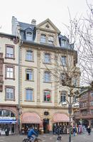 Der asymmetrisch auf dem Eckgrundstück errichtete viergeschossige Bau mit Mansarddach und Zwerchhäusern weist im Westen drei Achsen und im Süden fünf Achsen auf. Er wurde als Putzbau mit großzügiger Sandsteingliederung gestaltet. Die Läden des rustizierten Erdgeschosses erhielten bodentiefe Korbbogenfenster und Blattmasken als Schlusssteine. In die beiden Fassadenhälften sind jeweils mittig die aufwändig gestalteten Eingangsportale mit Oberlichtern eingelassen. Der Haupteingang mit Namenszug „Kopfapotheke“ findet sich an der abgeschrägten Ecke in einer von Rocaille-Ornamentik gerahmten Kartusche. Darüber, an der Stirnseite des Erkers angebracht, befindet sich eine Büste mit der idealisierten Darstellung eines Apothekers. Im Laden erhalten, wenn auch nicht in situ, ist ein von Max Läuger entworfener Jugendstil-Wandbrunnen, der zur ursprünglichen Ausstattung der Apotheke gehört.
