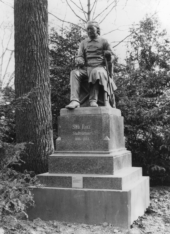 In der Tradition des Klassizismus 1893 nach Entwurf von H. Petry für den Stadtgärtner S. Rinz (1782-1861); gestufter Steinsockel mit Sitzfigur.