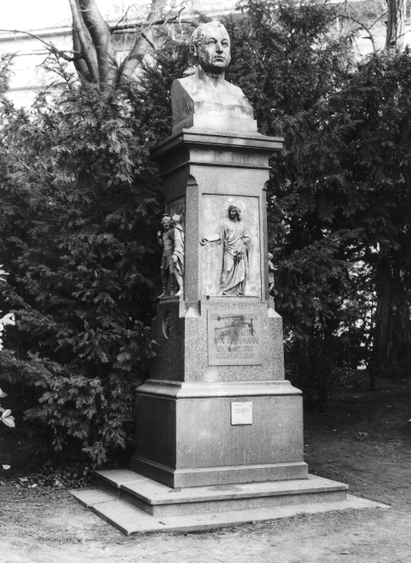 In der Tradition des Klassizismus 1868 nach Entwurf von E. Schmidt v. d. Launitz für den zugunsten der Stadt Frankfurt auch als Politiker tätigen Bankier S. M. v. Bethmann (1768-1826); über allegorischen Reliefs Bronzebüste.