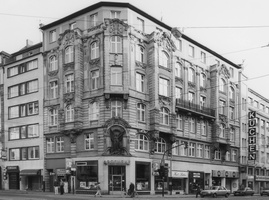 Neobarockes Wohn- und Geschäftshaus von 1905. Üppige Steinfassaden mit z. T. bizarr dekorierten Erkern (Vegetabiles, Muscheln, Maskarons) und allegorischer Engelsstatue über dem Eckportal; aufgesteckt anstelle des urspr. Mansarddachs.