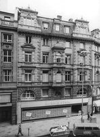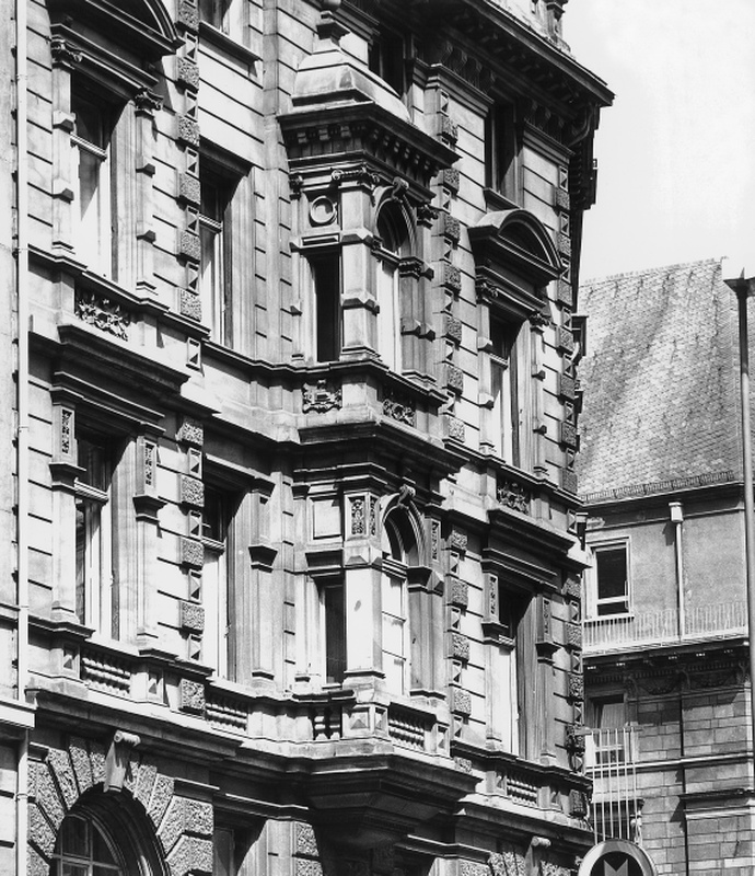 Geschäftshaus der Neurenaissance von 1876 nach Entwurf von A. Hänle. Repräsentative Steinfassade mit übergiebelten Eckrisaliten und axialem Kuppelerker (über unpassend verändertem Bogenportal).