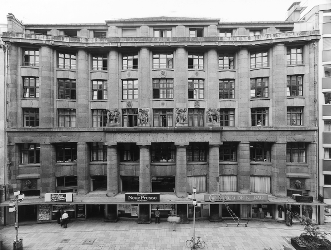 Monumentales Geschäftshaus des Neoklassizismus von 1913 nach Entwurf von A. Aßmann & L. Bernoully. Antikisierende, leicht konkave Fassade mit Kolossalsäulen und Puttengruppen.