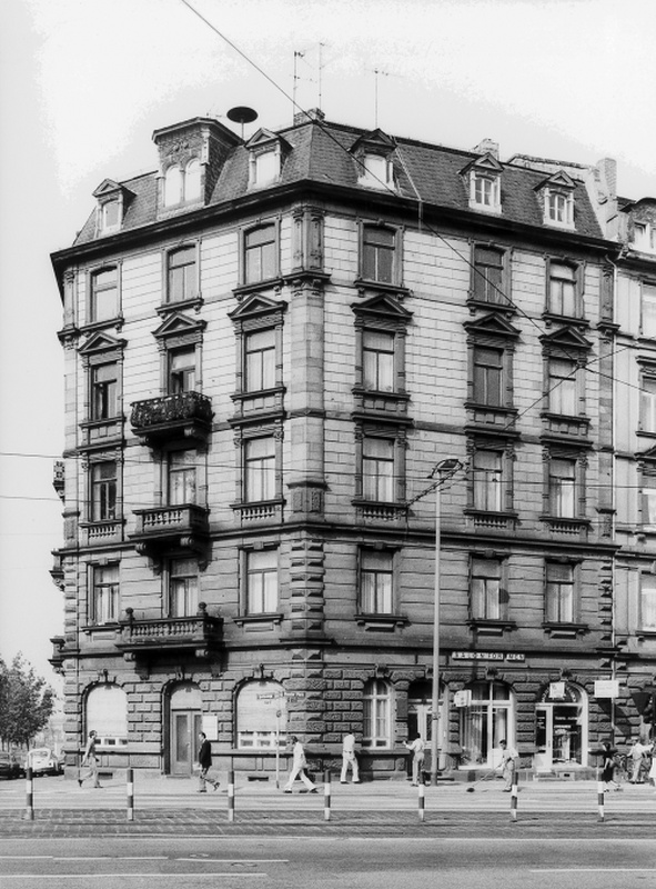 Mietshaus von 1890 in prominenter Eckposition mit symmetrischen Steinfassaden der Neurenaissance.