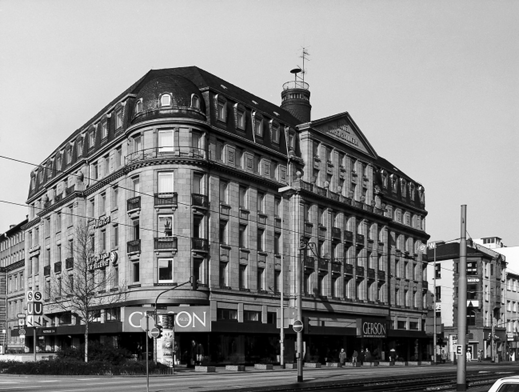 Geschäftshaus (urspr. Hotel) von 1915 nach Entwurf von W. Fischer & W. Müller als neoklassizistische Dreiflügelanlage mit übergiebelten bzw. überkuppelten Steinfassaden.