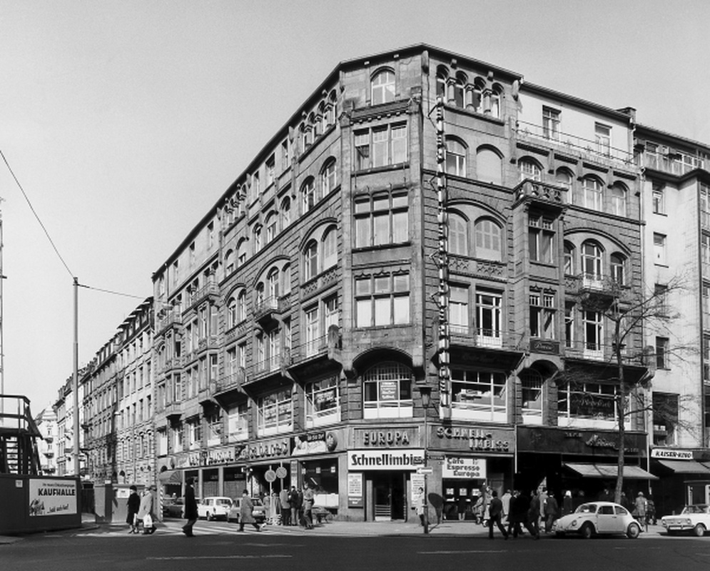 Geschäftshaus von 1900 nach Entwurf von J. Rindsfüßer &, M. Kühn mit hellen Steinfassaden in derben Mischformen aus Mittelalter und Renaissance; Dächer, Giebel und Ecktürmchen vereinfacht.