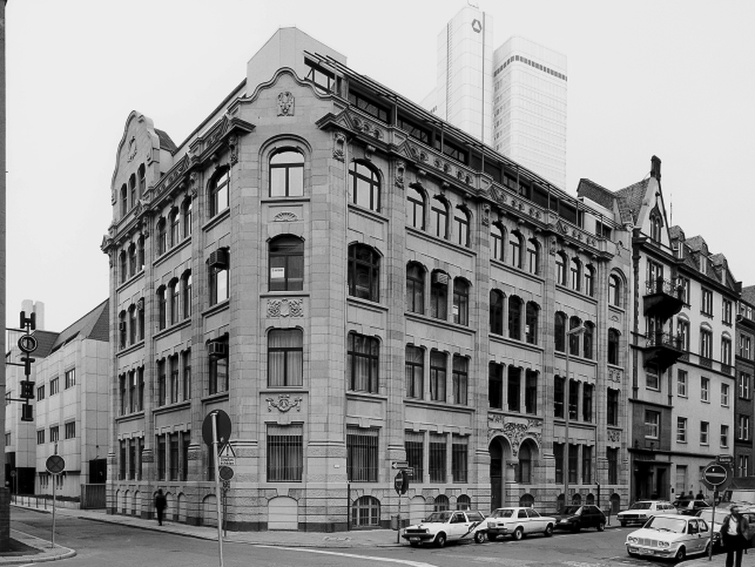 Geschäftshaus von 1906 nach Entwurf von W. Plate hinter Fassaden aus hellem Sandstein in Mischformen des Historismus: Gebäudeecke mit Wellgiebel, Portal mit reicher Bauplastik.