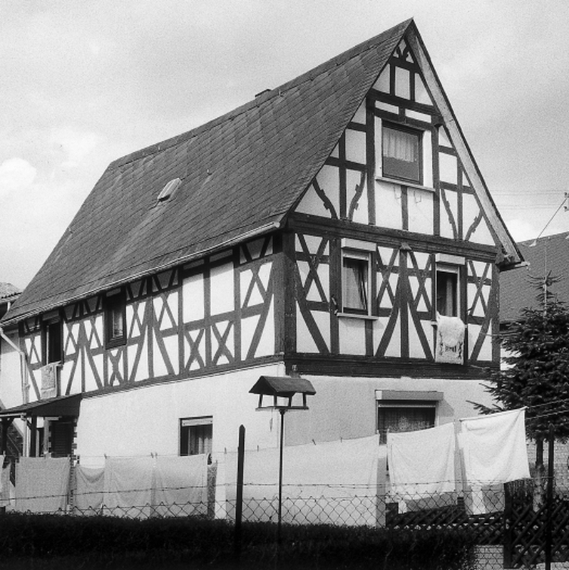 Der im Innenbereich des Straßenringes liegende Bau ist durch eine Sackgasse zugänglich. Diesem älteren Siedlungsmerkmal entspricht das Haus selbst mit seinem regelmäßig gruppierten und starken Fachwerkaufbau aus 3 Zonen und symmetrischem Giebel. Die Mann-Formen ohne Kopfbügen werden jeweils von zwei hochgestellten Andreaskreuzen begleitet und sind für das 17. Jahrhundert charakteristisch. Störende Fensterformate.