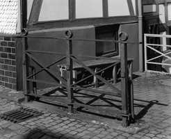 Vor dem mit 1833 datierten Fachwerkwohnhaus ist als Relikt des hier einst vorbeifließenden Mühlgrabens ein eisernes Geländer erhalten geblieben.