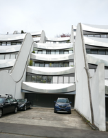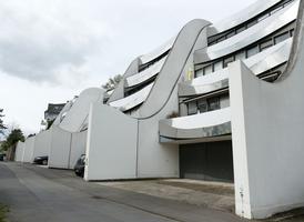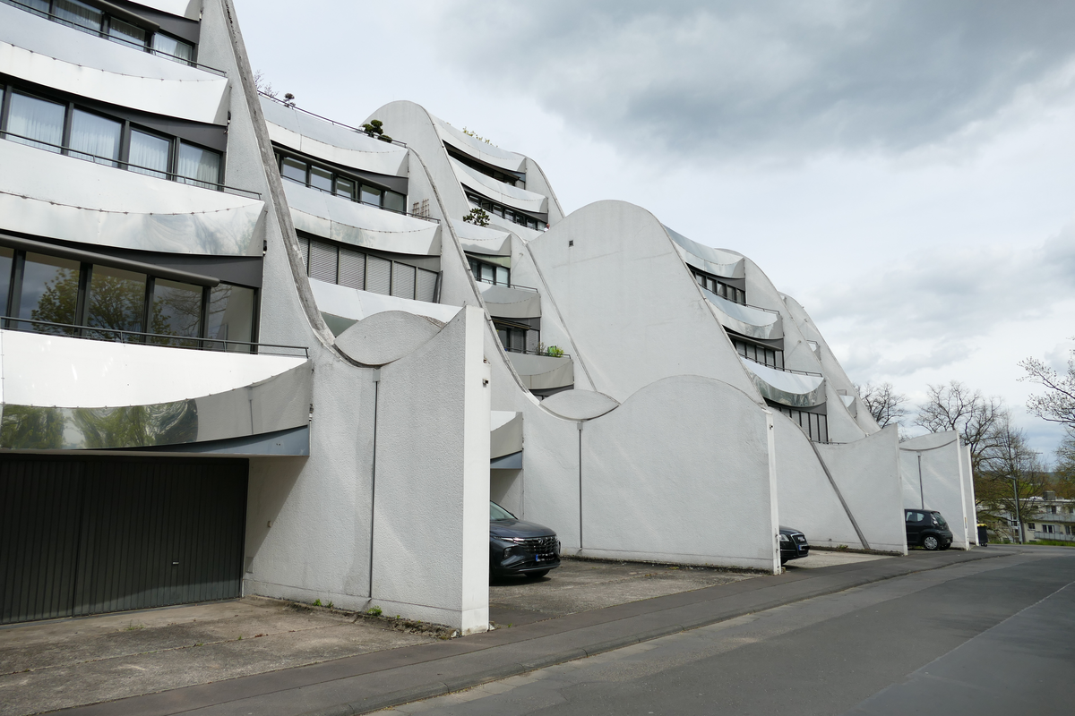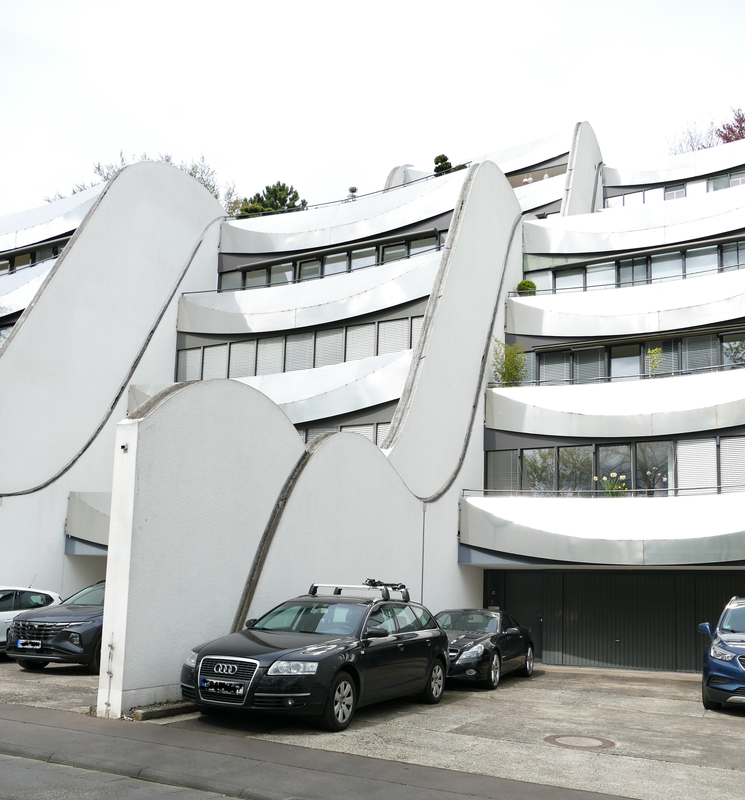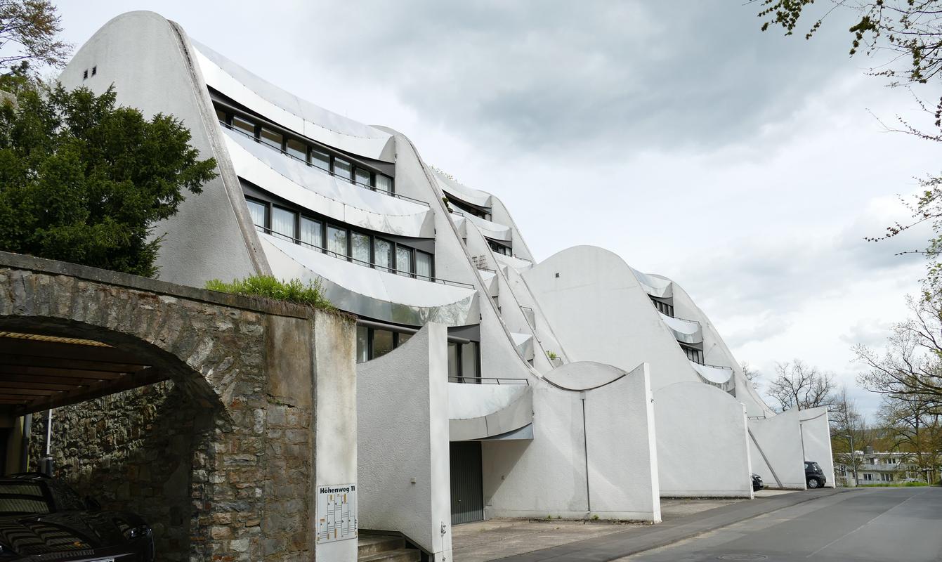 Für den Hang des Johannisbergs planten der Architekt Johannes Peter Hölzinger und sein Partner, der Zero-Künstler Hermann Goepfert, in der „Planungsgemeinschaft für neue Formen der Umwelt“ eine Wohnbebauung in Form eines Terrassenhauses. Der Bau wurde 1969-71 in einer Baulücke zwischen zwei Landhäusern der Zeit nach 1900 errichtet. Hölzinger erarbeitete auf Grundlage seiner Analyse der Landschaft um Bad Nauheim und ihrer Formen ein Konzept für drei Neubauten, deren zentraler Bezugspunkt der Johannisberg als die Region prägende Erhebung sein sollte. Die zu Wellen reduzierten Berg- und Talformen nahm der Architekt bei den zwei ausgeführten Bauten, dem Terrassenhaus in Bad Nauheim und dem Evangelischen Gemeindezentrum in Friedberg (vgl. Friedberg, Wintersteinstraße 39) in der Form von „Landschaftsschotten“ auf. Diese wellenförmigen Betonscheiben dienen bei der Wohnbebauung als Grundgerüst der aus acht zueinander versetzt angeordneten Wohnbauten bestehenden Anlage. Durch den Versatz entstanden Überschneidungen der einzelnen Wellensequenzen. Die Wohnetagen sind terrassenartig in die Struktur eingehängt, wobei die Balkongeländer aus gekrümmtem Aluminium bestehen, das im wechselnden Licht zusammen mit den Wellen bewegte Schattenspiele hervorruft. Innerhalb der übergeordeneten Großstruktur in Wellen- und Kaskadenform wurde durch eine Tragkonstruktion aus Wandscheiben und Decken eine höchstmögliche Flexibilität der Grundrisse erreicht. Städtebaulich fügt sich die ursprünglich auf Erweiterbarkeit ausgerichtete Anlage trotz der Größe durch die Aufnahme der Topographie und die skulpturale Kleinteiligkeit der sich überschneidenden Landschaftsschotten ein. Im Werk Hölzingers steht der Bau für die Phase der Partizipation und Flexibilität und spiegelt zugleich die enge Zusammenarbeit mit Goepfert im Sinne einer Objektarchitektur wider, deren Grundlage die Zero-Ideale Raum, Bewegung und Licht bildeten.