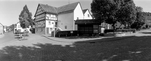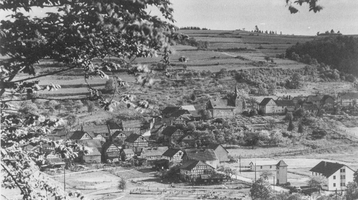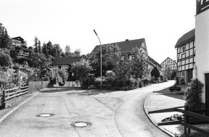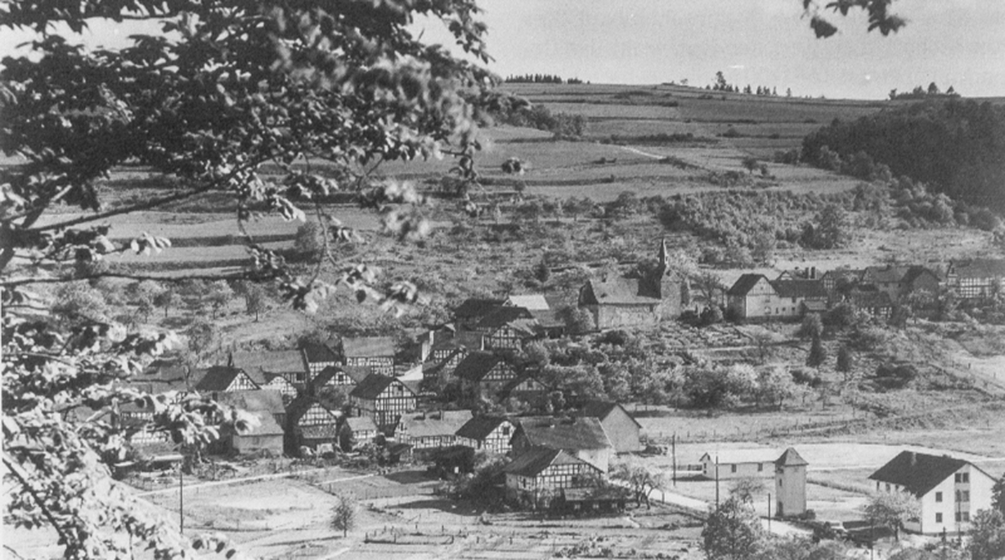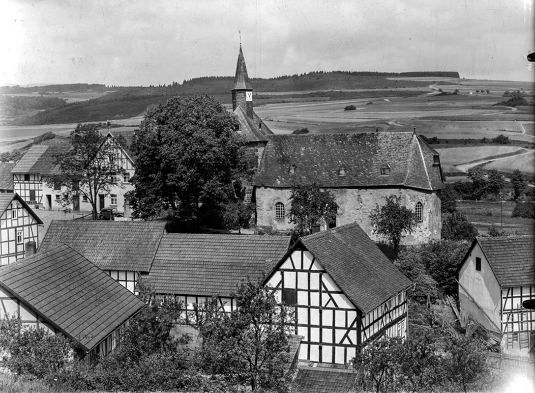 Braunshäuser Straße 13-19, 14-18; Hombergstraße 1-9, 4-10; Tiefenbachweg 1, 4-8; Unterm Berg 1-5, 2-12. Das bis in jüngste Zeit nur über schlechte, kurvenreiche Straßen zu erreichende Dorf konnte sich aufgrund seines geringen Wachstums den historischen Charakter des Dorfkerns bewahren. Das Zentrum des Ortes wird noch heute von der abknickenden Braunshäuser Straße und der im Knick einmündenden Hombergstraße markiert. Die Straße Unterm Berg, die zusammen mit den beiden anderen Straßen den zentralen Baublock umschließt, vervollständigt den historischen Grundriss des vom Kirchplatz im Westen abgeschlossenen Dorfkerns. Dieser Bereich ist noch immer von verschieden großen landwirtschaftlichen Gehöften geprägt, die in unterschiedlicher Anordnung ein aufgelockertes Straßenbild mit zahlreichen Aufweitungen und optischen Verengungen der Straßenräume schaffen. Die ältesten Gebäude wurden nach dem großen Brand 1788 errichtet, die Vervollständigung der Hofgebäude durch Scheunen und Ställe erfolgte im Laufe des 19. Jahrhunderts und lässt sich an der vorhandenen Bausubstanz deutlich ablesen.Über den Zustand des Dorfes gibt die Katastervorbeschreibung im Jahre 1788 Auskunft, in der das Dorf wie folgt beschrieben wird: "Die meisten Häuser des Dorfes sind zurzeit neu erbauet und in gutem, wohnbarem Zustand, einige wenige mit Ziegeln, die meisten aber mit Stroh bedeckt. Die geringen Häuser aber sind durchweg alt, klein und mit Stroh bedeckt."