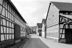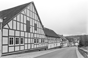 Der historische Ortskern Frohnhausens liegt als lang gestrecktes Haufendorf westlich der Kirche und südlich der Asphe. Drei annähernd parallele Straßen, Bachstraße, Am Dorfbrunnen und Schulstraße bilden, durch schmale Wege untereinander verbunden, die kleinen, unregelmäßigen Baublöcke, die nur mit wenigen großen Hofreiten bebaut sind. Den nördlichen Abschluss bildeten die heutigen Hofreiten Bachstraße 5 und 7, die sich jenseits der Asphe befinden. Seit dem frühen 19. Jahrhundert wuchs das Dorf über seine früheren Grenzen hinaus. Entlang der Ausfallstraßen – die beiden Arme der Dorfstraße, die Friedhofstraße und die Forsthausstraße – entstanden im Laufe des 19. Jahrhunderts unterschiedlich große Hofreiten, die zum Teil bis heute die Ortseingänge markieren. Das Zentrum Frohnhausens wird optisch durch große Haken- und Dreiseithöfe bestimmt, die zwischen dem ausgehenden 18. und dem frühen 20. Jahrhundert errichtet wurden. Insbesondere im Osten und Süden des Dorfes ist noch immer ein deutlicher Dorfrain mit scharfem Übergang der Bebauung in die umgebenden Grünlandflächen ablesbar.