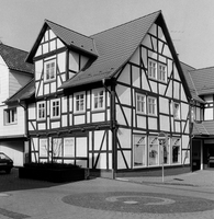 Traufständig orientiertes Fachwerkwohnhaus über einer städtebaulich akzentuierten Ecksituation ohne besonders ausgeprägte Gerüstfiguren. Die Schmuckformen im Bereich des Geschossüberstandes erleichtern eine Datierung: an der Unterkante der Schwelle Eierstab, Füllhölzer mit Schiffskehlen und eingelegtem Rundstab. Eine Bauzeit des Gebäudekernes um 1700 scheint somit möglich.