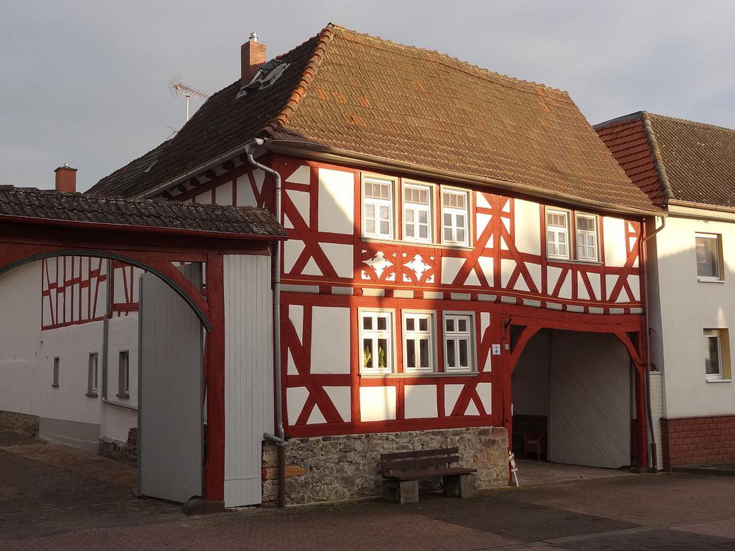 Baugeschichtlich und bautypologisches Fachwerk-Torhaus aus dem 17. Jh. auf Bruchsteinsockel. Komplett erhaltene Fachwerkfiguration aus der Erbauungszeit mit stark dimensionierten Hölzern, Hessischer Mannfigur und künstlerisch gestalteten Brüstungsfeldern. Kulturdenkmal aus ortsgeschichtlichen Gründen.