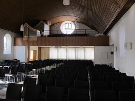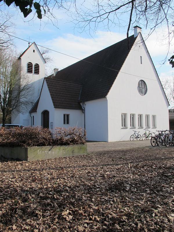 Betritt man die Kirche durch den Eingangsvorbau von Nordwesten, erschließt sich nach Osten ein weiß gefasster Saal, den eine Kiefernholz-Tonnendecke überfängt. Im erhöhten eingezogenen Altarraum, den eine hölzerne Kassettendecke beschließt und ein Rundfenster seitlich belichtet, wird der Marmor-Altarblock durch eine marmorverkleidete Kanzel begleitet. Dem gegenüber wird die Kirche nach Westen unter einem Rundfenster durch eine Orgelempore begrenzt. Ein verglaster Laufgang verbindet die Kirche nach Süden mit einem flachgedeckten Gemeindehaus auf polygonalem Grundriss. Weiter im Südwesten folgt, zur Straße „Im Hasenwinkel“ hin, das freistehende Pfarrhaus.