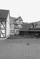 Das im Kreuzungsbereich zum Schulweg giebelständig aufgestellte Fachwerkgebäude stammt im Kern aus dem späten 17. Jahrhundert. Über dem Bruchsteinsockel steht eine zweigeschossige Rähmkonstruktion mit traufseitigem Geschossversprung. Die besonders im Obergeschoss symmetrische Fassadenkonfiguration ergibt sich durch zweifach verriegelte halbe Mannfiguren an den Eckständern. Balkenköpfe und Füllhölzer im Geschossversprung sind abgerundet, die Eckständer tragen stilisierte Säulenmotive.