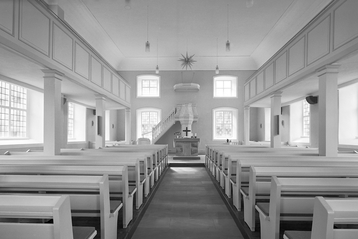 Die 1786 fertiggestellte Kirche steht im Ortszentrum auf dem ehemaligen Wehrkirchhof. Die klassizistische symmetrische Fassade ist horizontal in zwei Geschosse mit einfachen Rechteckfenstern gegliedert, darüber liegt ein Walmdach. An der Ostfassade ist der ehemalige Eingang ablesbar; seit den 1950er Jahren liegt er im Turmbereich. Der nordwestlich eingestellte Turmbau ist mit Schiefer verkleidet und birgt drei Glocken sowie die Turmuhr. Die polygonale Laterne schließt mit einer Welschen Haube ab. Der schlichte Innenraum mit Voutendecke ist auf die an der Südseite zentral angebrachte Kanzel ausgerichtet, an der Ostseite ist eine Empore.