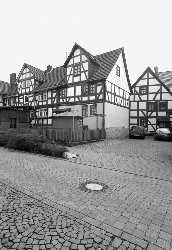 Im Eingang zum Weißen Hof steht auf quadratischem Grundriss ein zweigeschossiges Fachwerkgebäude unter Satteldach. Es wurde ursprünglich als Wohnhaus in der zweiten Hälfte des 18. Jahrhunderts errichtet. Die Rähmkonstruktion mit traufseitigem Geschossversprung steht auf einem Sandsteinsockel. An den Eckständern im Obergeschoss zweifach verriegelte halbe Mannfiguren und Diagonalstreben in den Brüstungsfeldern. Das Erdgeschoss ist heute verputzt oder massiv erneuert.