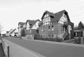 Anfang des 20. Jahrhunderts errichtetes Wohnhaus. Eingeschossiges Gebäude mit hoher Sockelzone, Drempelgeschoss, Krüppelwalmdach. Erdgeschoss in Ziegelmauerwerk. Fensteröffnungen mit Rundbogenabschluss, Fensterbänke aus Sandstein. Drempelgeschoss mit historisierender Fachwerkkonstruktion mit K-Streben. Die auskragenden Pfetten- und Balkenköpfe sind profiliert.