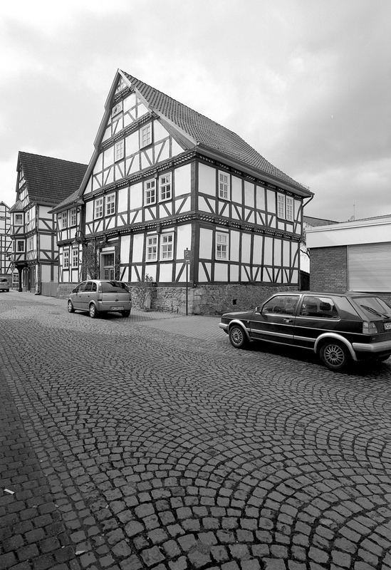 Das Wohnhaus wurde in der ersten Hälfte des 17. Jahrhunderts erbaut. Nach Westen befindet sich ein zweigeschossiger Anbau aus dem 19. Jahrhundert. Der Baukörper präsentiert sich als zweigeschossige Rähmbauweise mit Brüstungsstreben und einzelnen gebogenen Dreiviertelstreben. Umlaufender Geschossüberstand mit Taubandmotiven.
