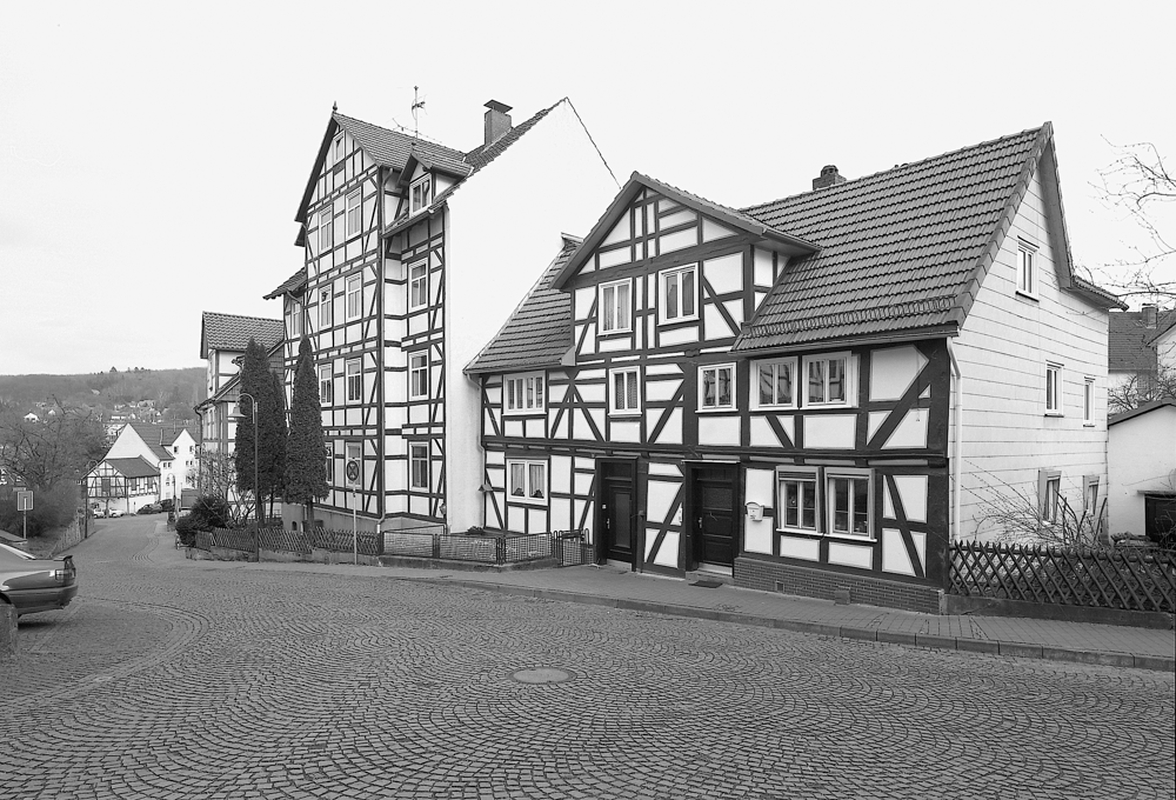 Im Kreuzungsbereich gelegenes zweigeschossiges Doppelwohnhaus aus der zweiten Hälfte des 18. Jahrhunderts. Zweifach verriegelte Mannfiguren an Bund- und Eckständern, traufseitig profilierter Geschossüberstand. Im Satteldach ist ein breit gelagertes Zwerchhaus eingelassen.