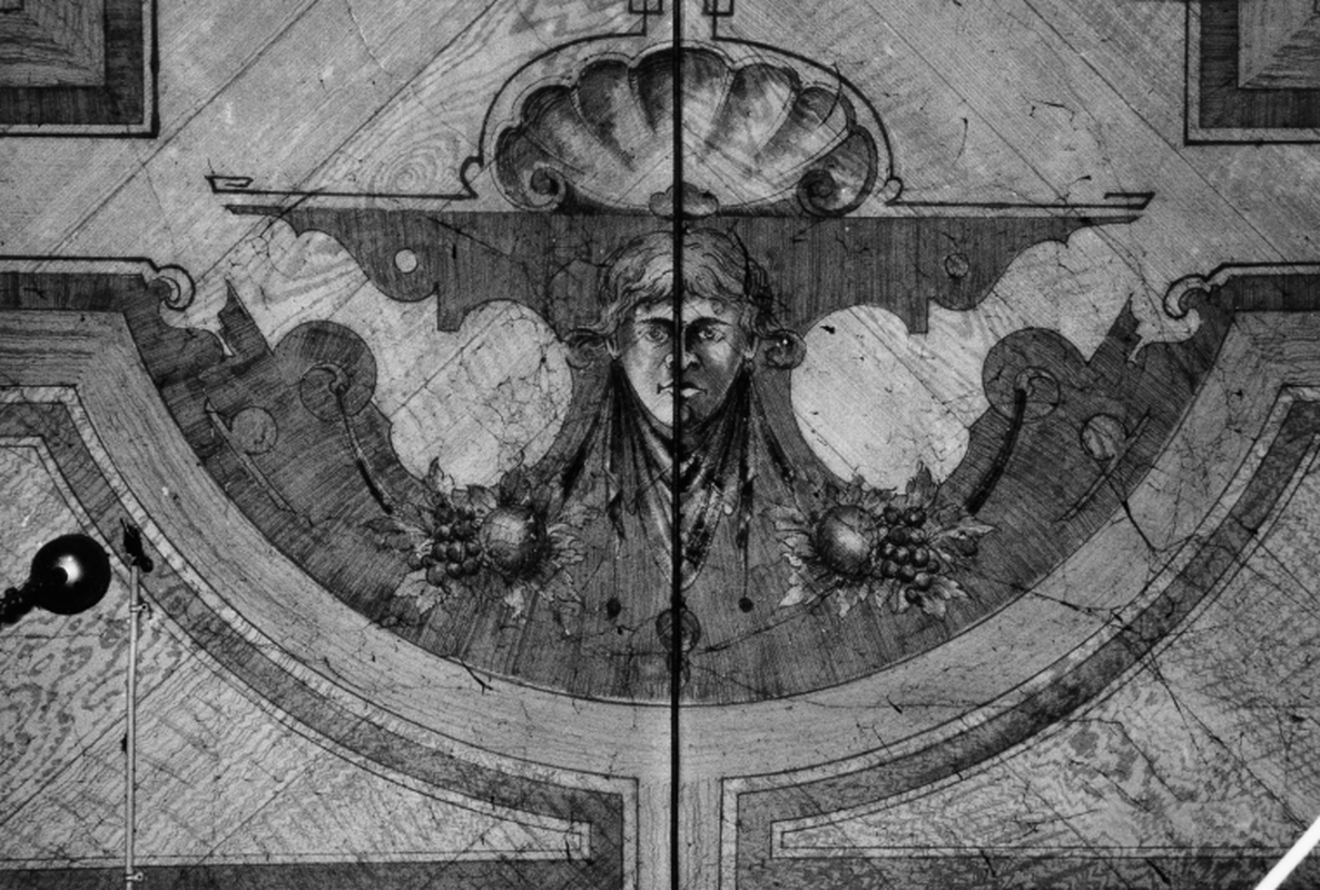 Noch original erhaltene, 1989 restaurierte Deckenmalerei mit Stuckrosette und umlaufendem Stuckfries in einem ehemaligen Ladengeschäft (heute Wohnung) im Erdgeschoß des Gebäudes. Durch Maserierung auf glattem Putz ist eine Holzdecke vorgetäuscht, auf der geometrische Muster und Motive aufgemalt sind, die auf eine ehemalige Weinhandlung schließen lassen. Diese Malerei ist typisch für die Ausstattung eines gründerzeitlichen Ladens.