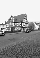 Wohnhaus einer ehemaligen Streckhofanlage aus der ersten Hälfte des 18. Jahrhunderts. Zweigeschossiger Rähmbau mit umlaufendem profiliertem Geschossüberstand. Mit einfach verriegelten Dreiviertel- und Brüstungsstreben ausgesteift. Die Eckständer sind mit geschnitzter Taubandornamentik verziert. Im Hofbereich ist teilweise das historische Sandsteinpflaster erhalten.
