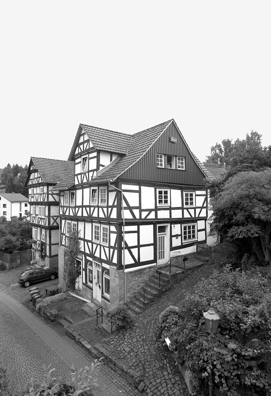 Das dreigeschossige Fachwerkwohnhaus springt leicht aus der Bauzeile hervor. Es wurde um die Mitte des 18. Jahrhunderts als Einhaus errichtet. Über dem Sockelgeschoss aus Bruchsandstein steht in zwei Geschossen eine Rähmkonstruktion mit umlaufenden profiliertem Geschossüberstand. An den Eckständern der Straßenfassade verstärken zweifach verriegelte Mannfiguren die Konstruktion. Die Erschließung erfolgt auf der westlichen Giebelseite über eine Sandsteintreppe, das Gelände ist zum Teil mit Sandstein gepflastert.