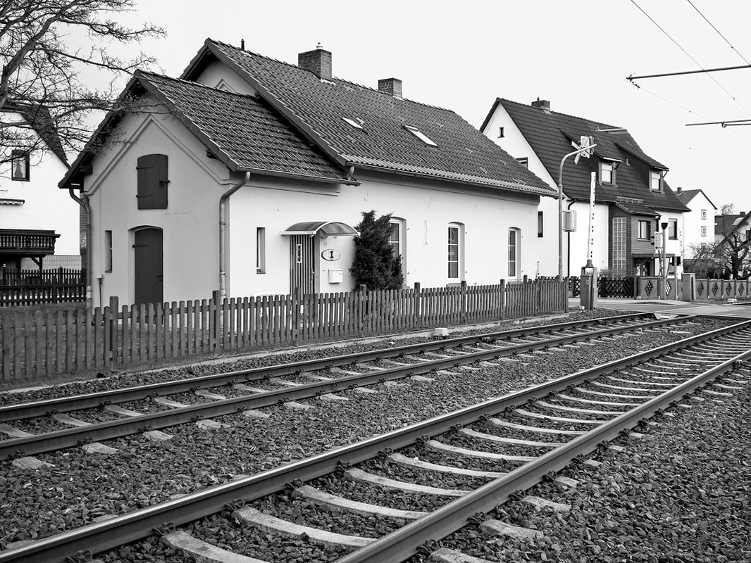 Eingeschossiges Bahnwärterhaus aus dem frühen 20. Jahrhundert. Dreiachsige Fassadengliederung durch hochformatige Fensteröffnungen mit Segmentbogenabschluss. Mit Naturstein abgesetzte Fensterbänke. Bei dem an der östlichen Giebelseite anschließenden Wirtschaftstrakt ist die historische Dachdeckung erhalten.
