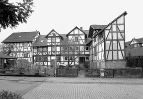 Fachwerkwohnhaus mit L-förmig angebautem Wirtschaftsgebäude. Ehemaliges traufständiges Einhaus mit einläufigem Treppenaufgang und mittig aufgesetztem Zwerchhaus, datiert ca. 1800. Wohnhaus in konstruktiver Rähmbauweise mit profiliertem Geschossüberstand. Das Wirtschaftsgebäude wurde giebelständig zur Straße über einer hohen Sockelzone aus Sandstein mit vier nebeneinander liegenden Stalleingängen errichtet.