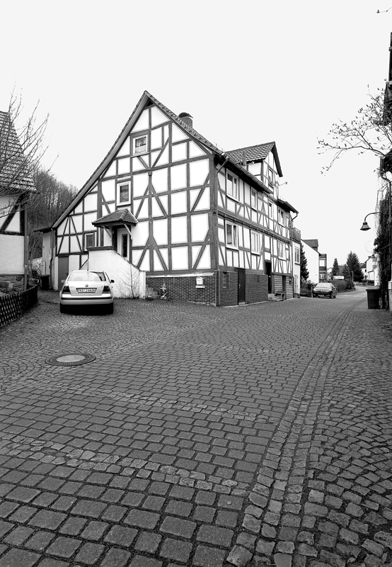 Zweigeschossiges traufständiges Fachwerkgebäude aus der zweiten Hälfte des 18. Jahrhunderts, heute in zwei Gebäudehälften geteilt. Rähmbau aus Eichenfachwerk mit traufseitigem Zwerchhaus auf einem hohen Sandsteinsockel. Mannfiguren an Bund- und Eckständern. Traufseitiger Geschossüberstand mit gerundeten Füllhölzern und Balkenköpfen.