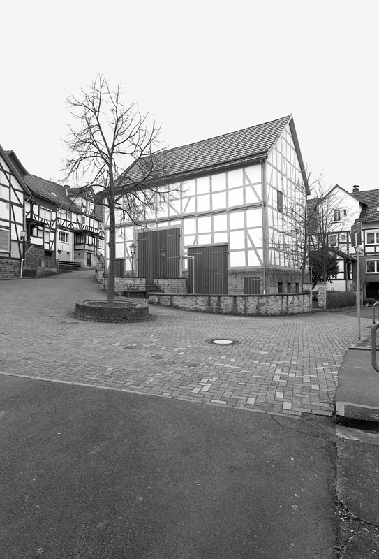 Die Scheune ist als Wirtschaftstrakt der untergegangenen Obermühle anzusprechen. Inschrift: "Zm [Zimmermeister] A. Rasch Johann Ulrich Umbach und dessen Ehefrau Anna Elisabeth gebohrene Löwer die haben Gott vertraut und dieses Haus gebauet den 28. Mai1824". Die Familie Umbach war damalige Betreiberin der Obermühle. Die Fachwerkkonstruktion ist verfestigt durch einfach verriegelte Dreiviertelstreben.