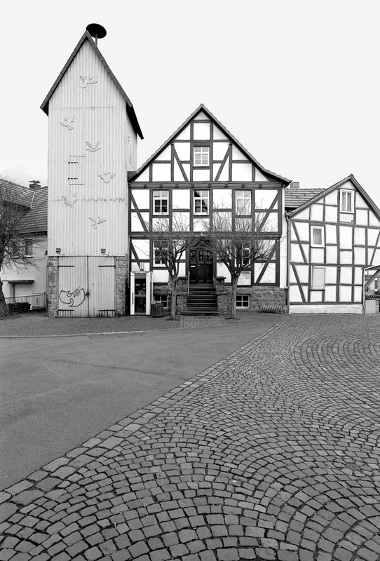 Das Rathaus wurde im ausgehenden 18./frühen 19. Jahrhundert errichtet. Einfach verriegeltes Fachwerkgefüge mit Langstreben an Bund- und Eckständern, profilierter Geschossüberstand. Die rückwärtige Giebelfassade zeigt im Obergeschoss ein mit Langstreben verriegeltes Gefüge. Das nördlich anschließende Spritzenhaus mit Schlauchturm aus den 1930er-Jahren durchgreifend verändert.
